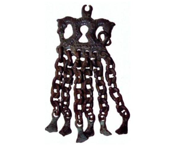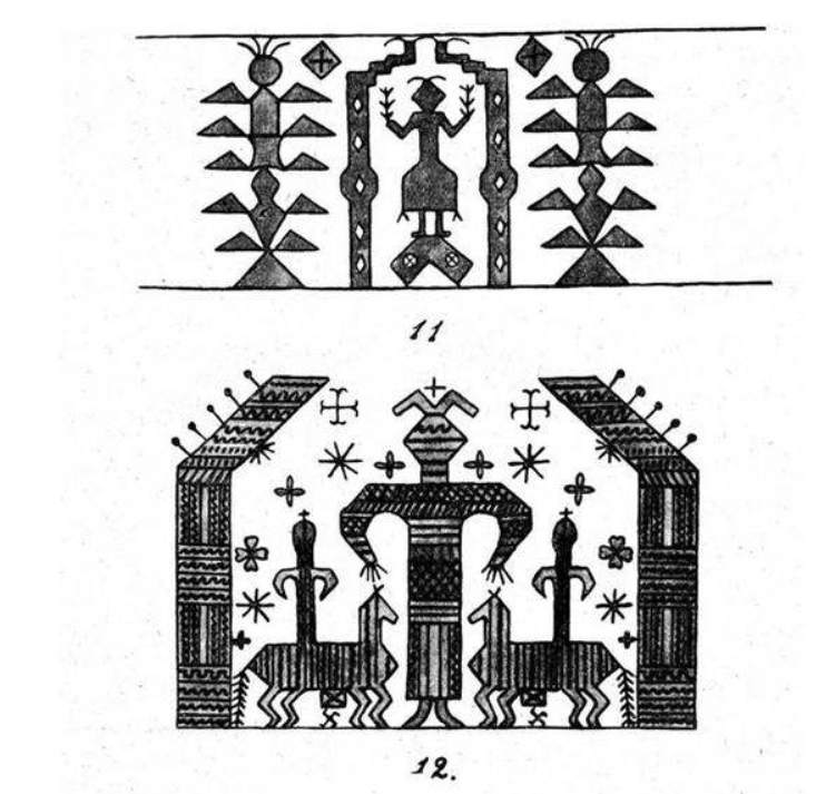 5. Так же, как и ведийские матери-богини, образ божественной матери-прародительницы Руси получил визуальное воплощение. Образ Руси — матушки отразился в ритуальной русской вышивке. Далее, согласно моим исследованиям, северорусская вышитая иконография перекликается с таким уникальным источником, как произведения пермского звериного стиля (ПЗС). Абрис шумящих подвесок выявляет фигуру женщины в широкой юбке с разведенными в стороны или лежащими на бедрах руками, напоминающую вышитую древнерусскую великую матерь всего сущего или мать-прародительницу Русь. Этот же образ проступает на золотой пластине, найденной вкургане Карагодеуашх Краснодарского края.