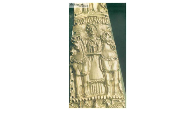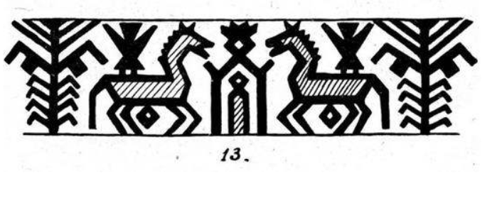 Комментарий к файлу: Золотая пластина из кургана Карагодеуашх. Во втором ярусе великая богиня представлена стоящею между двумя конями, что обнаруживает явное сходство с изображениями великого женского божества на русских вышивках.