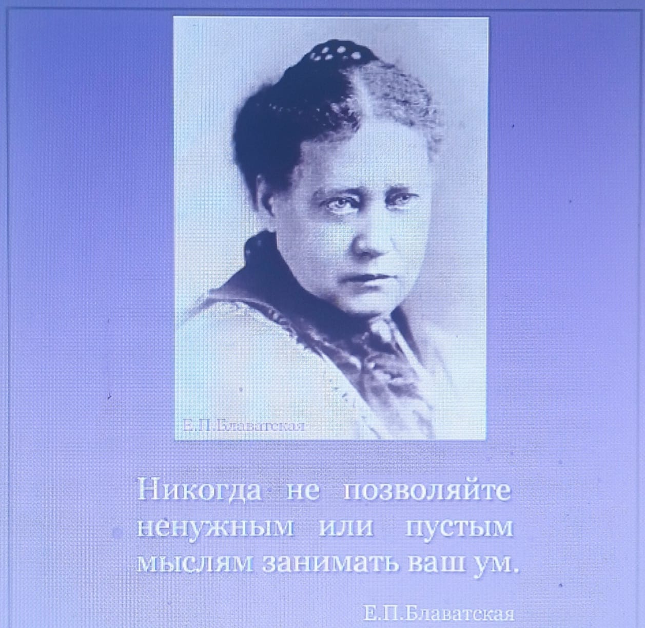 "Великому духу Елене Петровне Блаватской сегодня 192 года со дня ее появления на свет. В моей жизни она значит чрезвычайно много. Наша связь в веках нерасторжимо крепка, она продолжается, и будет продолжаться всегда. Брат Хирониус, как наставник моей души, очень близок ко мне, и скрывать этого, наверное, ни к чему, потому что претендовать на то, что книги даются из другого источника, было бы непростительной ложью. Весь свод духовной литературы есть Живая Этика, начиная с писаний Великого Уру – непревзойденного Целителя времен заката Атлани, которые когда-нибудь будут найдены или продиктованы чьей-то чистой душе. И далее из всех сохранившихся трудов Пифагора, Платона и Учителей Античности, и ранних и средних веков. Живая Этика – непрекращаемый поток великой традиции человеколюбия. И если помним Эхнатона, Сераписа, Явлиха, Благословенного Будду, а после него – Зороастра и Христа, вплоть до Е.П.Б. и Е.И.Р., то мы должны относиться к этому, как к единому потоку неиссякаемой Мудрости, который никогда не иссякнет, обретая новые просторы познания, которые дозволено открыть желающим видеть шире Космос Знаний.