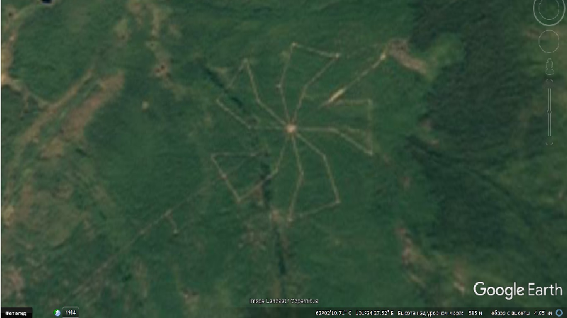 По координатам 62.043184, 101.556438 находятся самые большие в России, да, наверное, и самые большие в мире геоглифы. Огромные рисунки сделанные в скальном грунте. Протяженность рисунков добрая, сотня с лишним километров. Каждый рисунок шириной почти в два (!) километра. Рисунки, правда, все однотипные. Видимо это схематическое изображение звёзд неизвестной нам галактике. И таких звезд там несколько десятков. Кроме того все звёзды идут в четком порядке. Они разграничены равными секторами, немного похожими на дороги. Скорее всего это широта, долгота и проекции по меридианам. А сектора состоят из звёздных систем. Значит геоглифы привязаны к определенному месту. Знать бы ещё где это находится...