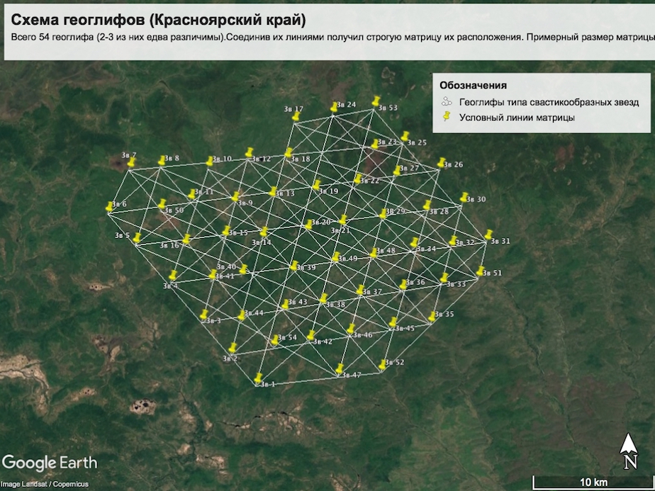 Провел исследование на спутниковом изображении. Обнаружил 54 (шестью девять?..) геоглифа (2-3 из них едва различимы). Рисунки на поверхности земли типа свастикообразных звезд. Соединив их линиями получил строгую матрицу. Примерный размер всей матрицы порядка 30 на 24 км. Вот так чудеса!!!