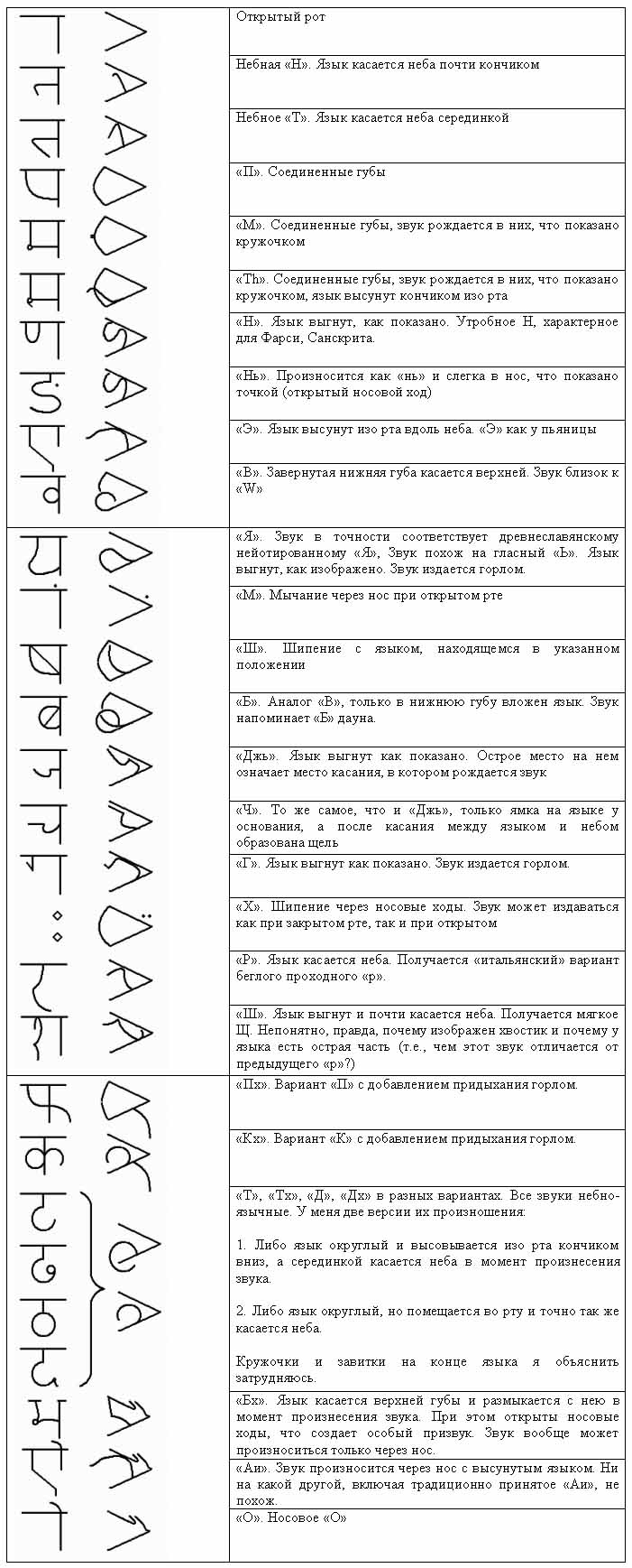 Предположим, что, как и в случае с кириллической группой алфавитов, каждый знак Деванагари представляет собой схематическое изображение рта и органов речи в момент произнесения звука. Символика в данном случае будет несколько другая, чем в протокириллице. Никаких условных обозначений для касаний и препятствий в деванагари мы не найдем. Здесь картинка и только картинка. Будто схематизированная фотография рта сбоку. Верхнее нёбо — горизонтальная черта, нижняя челюсть — вертикальная. Рот получается всегда открыт и смотрит вправо-вниз. В деванагари зубы никогда не изображаются. Вообще никогда. Ни в одном символе! - рис.1.