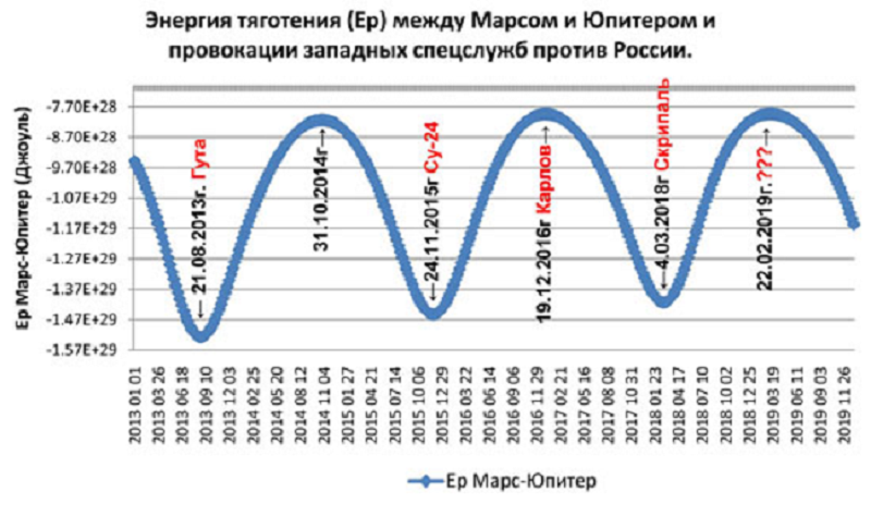 Отметим, что мы здесь не рассматриваем и не обсуждаем механизм связи между космической погодой, которая в моменты изменений потенциальной энергии тяготения (минимумы и максимумы) имеет экстремальные значения, и ее влиянием на психику. На графике мы видим три минимума потенциальной энергии (21 августа 2013; 24 ноября 2015; 4 марта 2018гг.), произошедшие синхронно с тремя явными провокациями спецслужб (Гута, Су-24, Скрипаль). И два максимума энергии тяготения: 31 октября 2014г., когда явных провокаций и терактов не было (по-видимому, спецслужбы были заняты войной в Донбассе, где в конце октября – начале ноября 2014 года шли активные боевые действия). Второй максимум энергии тяготения Марс-Юпитер в декабре 2016 года точно совпал с убийством в Турции российского посла Андрея Карлова. На рисунке видно, что следующий максимум потенциальной энергии Марс-Юпитер приходится на 22 февраля 2019 года, когда нужно ждать, как новых провокаций западных спецслужб, так и «спонтанной» активности террористов.
