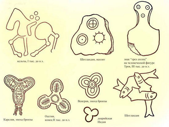 Итак, концепция трех времен в круге вечности принадлежит только высоко развитым цивилизациям; Знак Триединства много старше этих представлений. Чтобы проникнуть в его древнейшую символику, нам необходимо обратиться к универсалиям человеческого мышления, то есть тем представлениям, которые сохранены в нашем подсознании и проходят сквозь всю историю человечества.