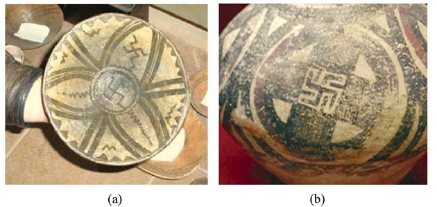 Комментарий к файлу: (а) Свастика на тарелке из трипольской культуры (7500-4650 лет назад). Обратим также внимание на знаки W (или М) по окружности тарелки, они такие же, как на предметах из культуры Лепенского Вира; (b) свастика на сосуде из культуры Янгшао, Китай (8000-4000 лет назад). По данным: Klyosov A.A., Mironova E.A. (2013). A DNA Genealogy Solution to the Puzzle of Ancient Look-Alike Ceramics across the World. Adv. Anthropology, Vol. 3, No. 3, pp. 164-172.